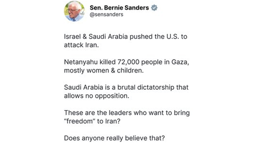 স্যান্ডার্স তাঁর পোস্টে ইসরায়েলের প্রধানমন্ত্রী বেনিয়ামিন নেতানিয়াহুর কঠোর সমালোচনা করে বলেন, গাজায় ইতোমধ্যে ৭২ হাজার মানুষকে হত্যা করা হয়েছে, যাদের অধিকাংশই নারী ও শিশু। তিনি সৌদি আরবকেও একটি ‘নির্মম একনায়কতান্ত্রিক রাষ্ট্র’ হিসেবে অভিহিত করেন, যেখানে ভিন্নমতের কোনো স্থান নেই। এই দুই দেশের নেতারাই এখন ইরানে ‘স্বাধীনতা’ আনতে চায় কি না—এমন প্রশ্ন তুলে তিনি মার্কিন নীতিকে প্রশ্নবিদ্ধ করেছেন।