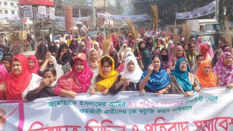 বগুড়ায় জামায়াত আমিরের বক্তব্যের প্রতিবাদে মহিলা দলের ঝাড়ু মিছিল